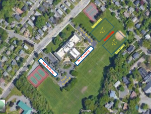 IMPORTANT NOTE: When parking at Warren Field, please note that you should only park in spaces identified for recreational parking. The spaces marked resident and visitor parking are for use by the adjacent residential building.  If you park in one of the spaces for the building or in an unmarked spot blocking access, you will be towed.